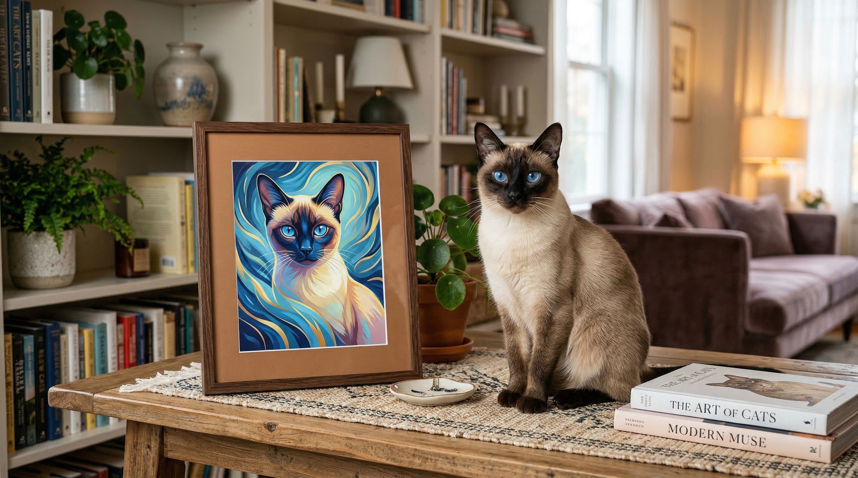 Canvas prints, custom mugs, phone cases, and more — all featuring your Siamese's regal face and iconic blue eyes. If your Siamese is going to judge the decor anyway, they might as well be IN the decor.